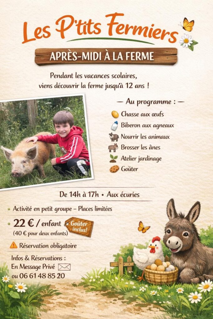 👉 Sur un créneau de 2 à 3 heures (environ 14h – 17h), les enfants pourront venir vivre un vrai moment à la ferme, au contact des animaux, dans une ambiance douce et familiale.