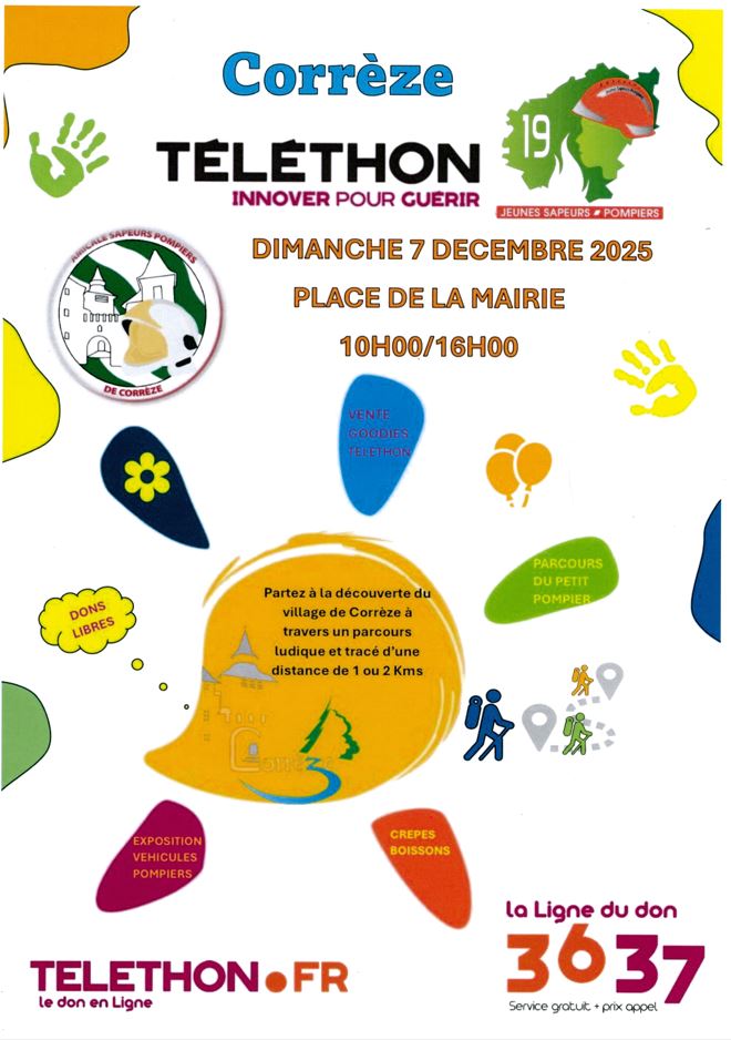 Le SDIS19 organise une journée au profit du Téléthon le dimanche 7 décembre à partir de 10h00 place de la mairie et dans la salle du centre Culturel.