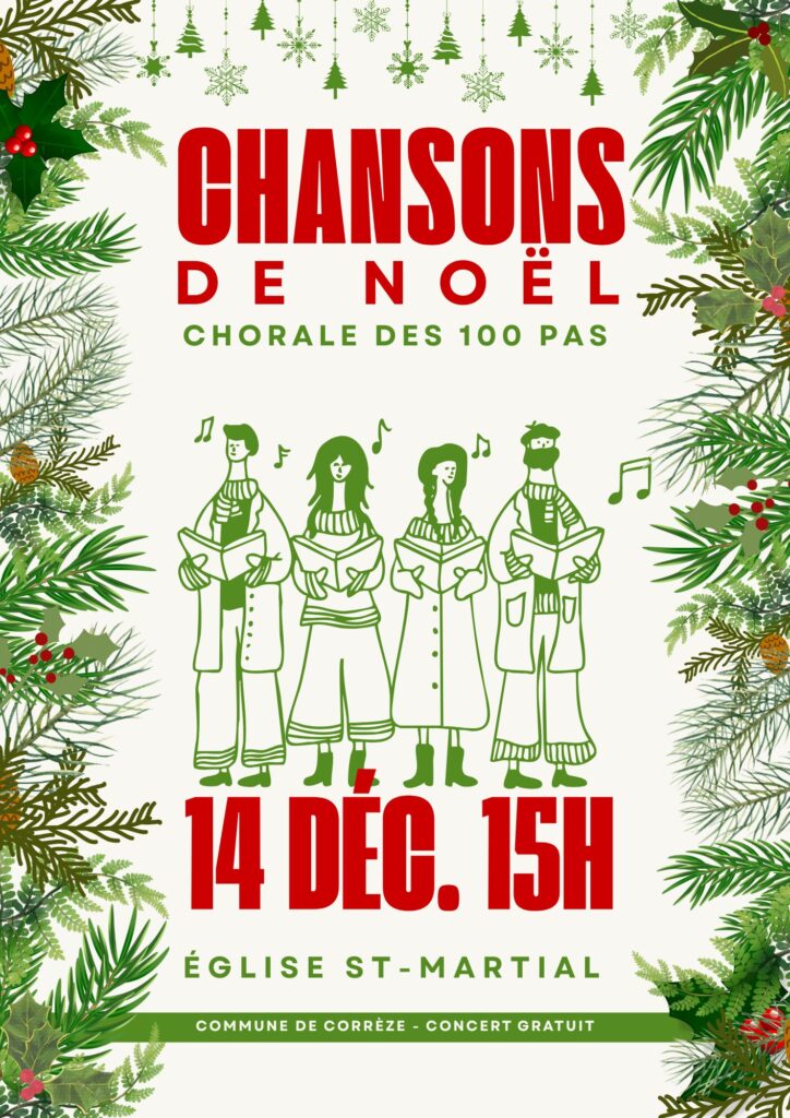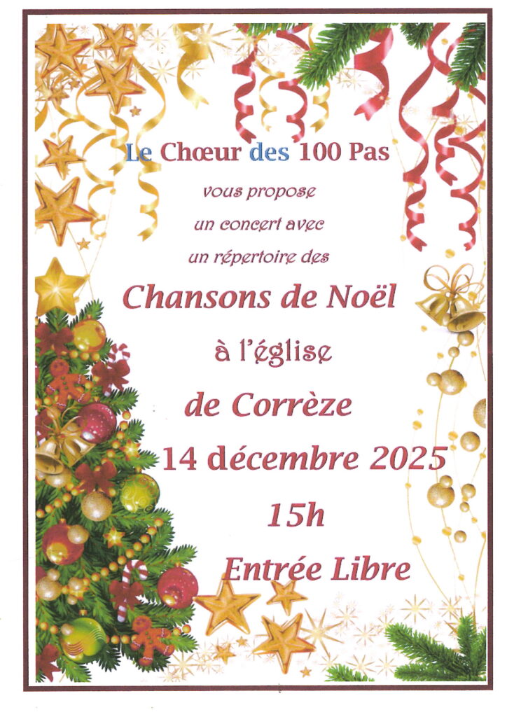 14/12 : Concert – chants de Noël Animations/Evenement/Culture Mis à jour le mercredi 26 novembre 2025 La chorale des 100 Pas vous propose un concert de chants de Noël gratuit le dimanche 14 décembre à 15h à l’Église de Corrèze. Merci à Monica et à tous les membres de la chorale de 100 Pas pour cet évènement très apprécié par tous les corrézois.