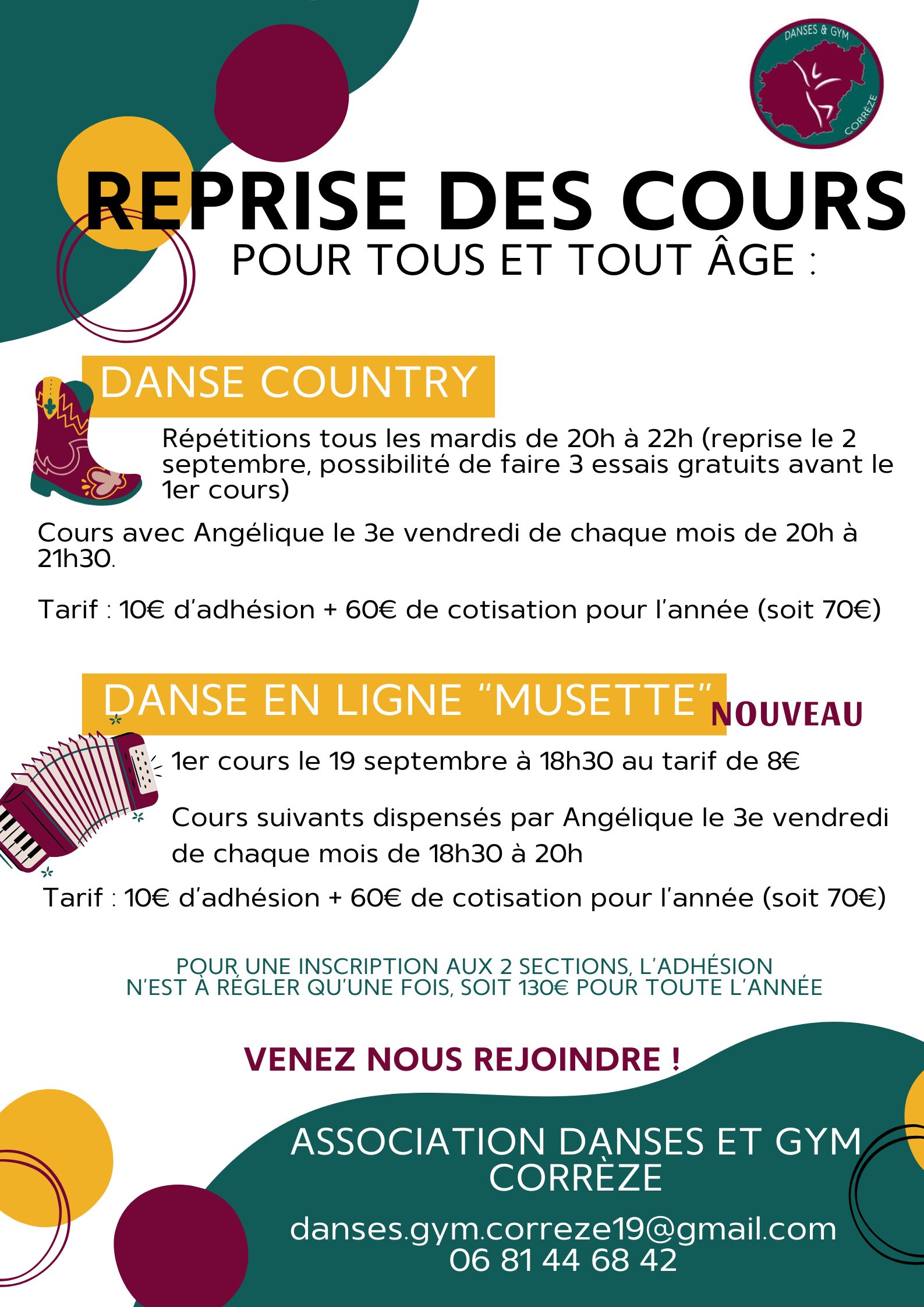 L’association Danses et Gym vous propose de découvrir ou de vous perfectionner en danse Country tous les mardis à 20h et en danse Musette en ligne tous les vendredis à 20h.